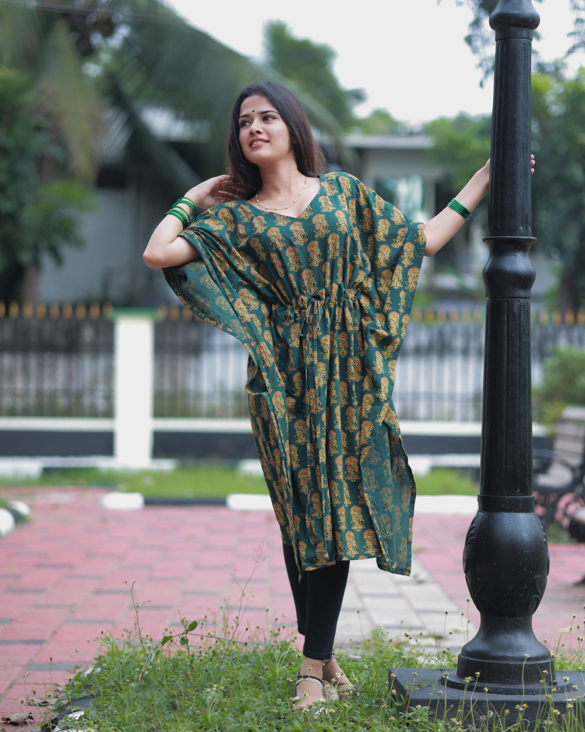 Handcrafted in soft Cotton fabric, this free-size Kaftan is a comfy wardrobe essential. For added comfort, it includes an adjustable drawstring.