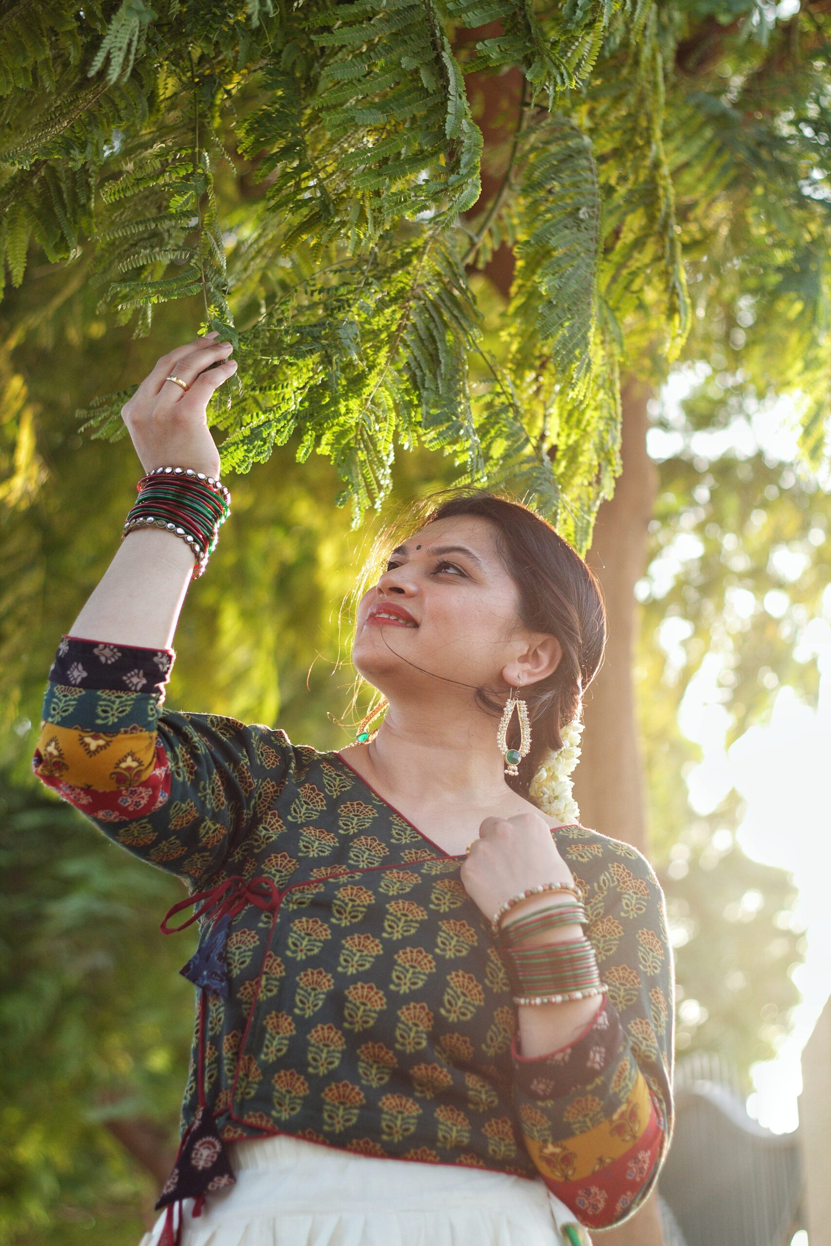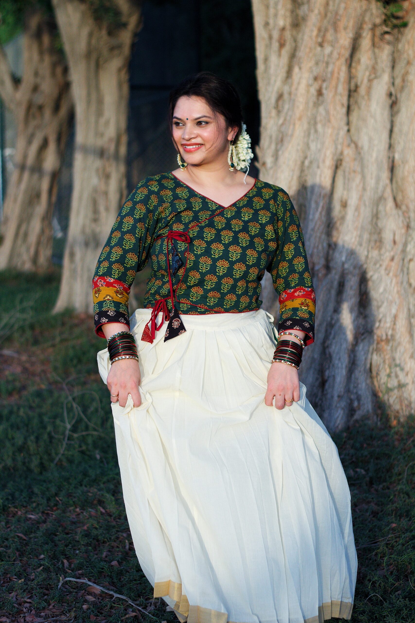 A contemporary Ajrakh hand block print wrap up ajrakh crop top paired with an  skirt or saree. The rich, rustic hues make it a perfect  ensemble, blending elegance with comfort. Ideal for festive gatherings or a chic casual look!