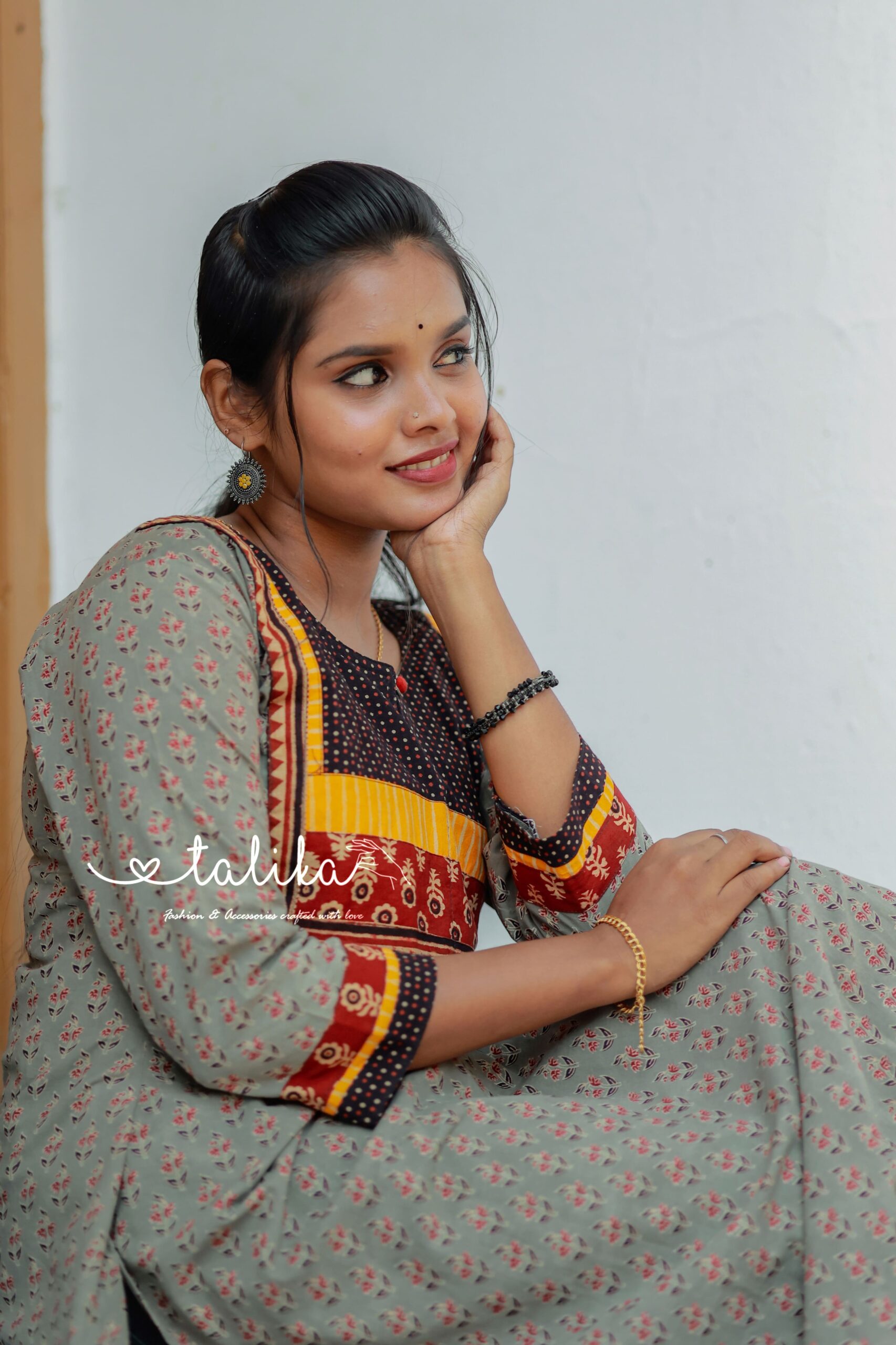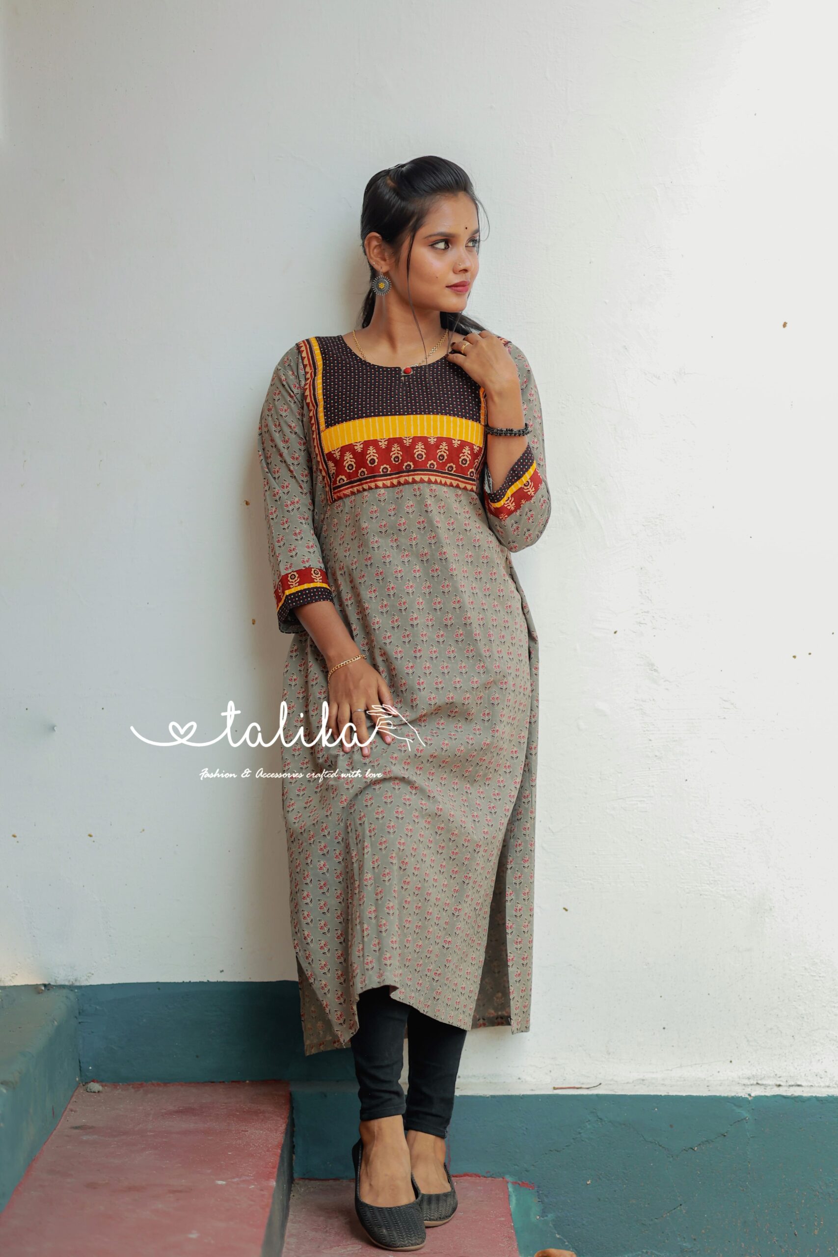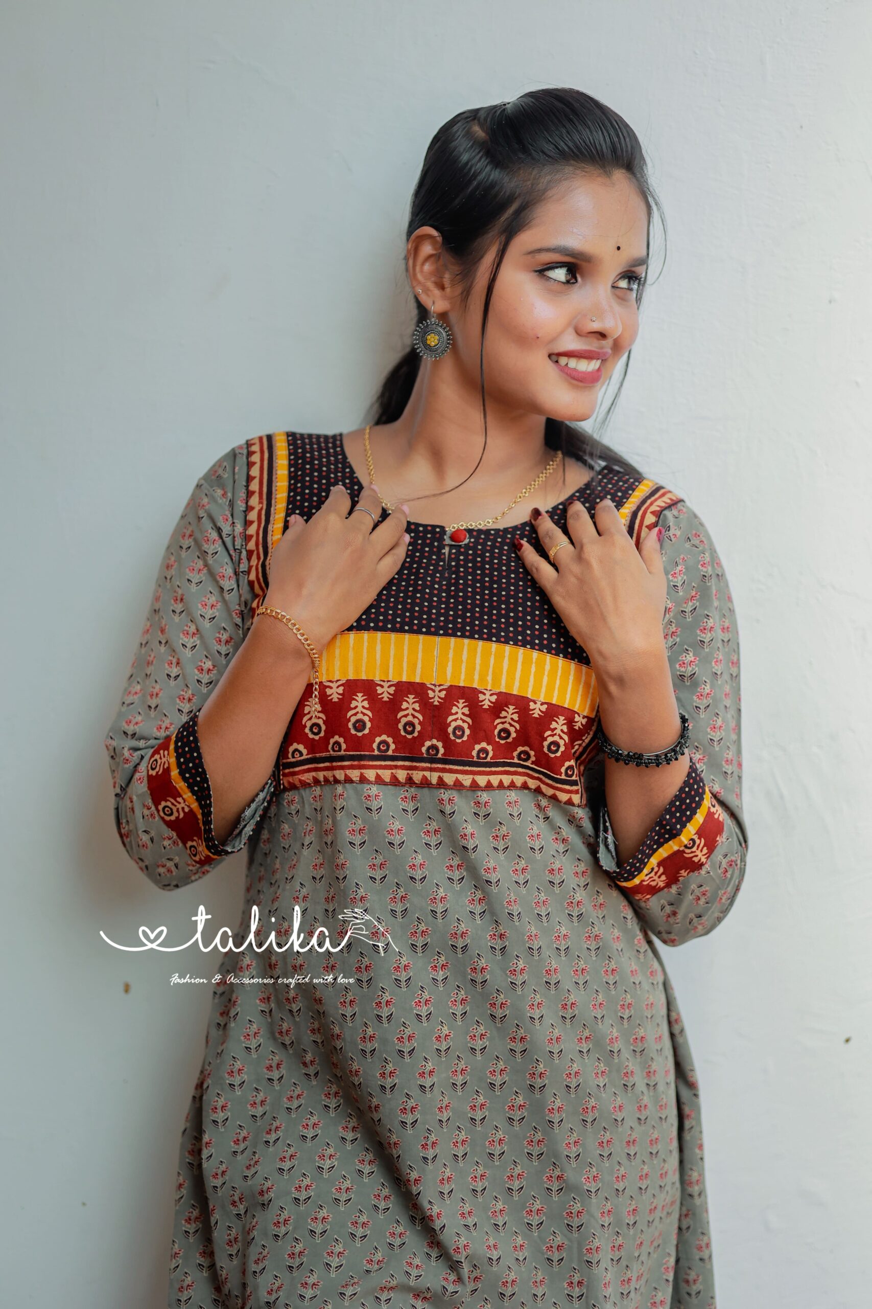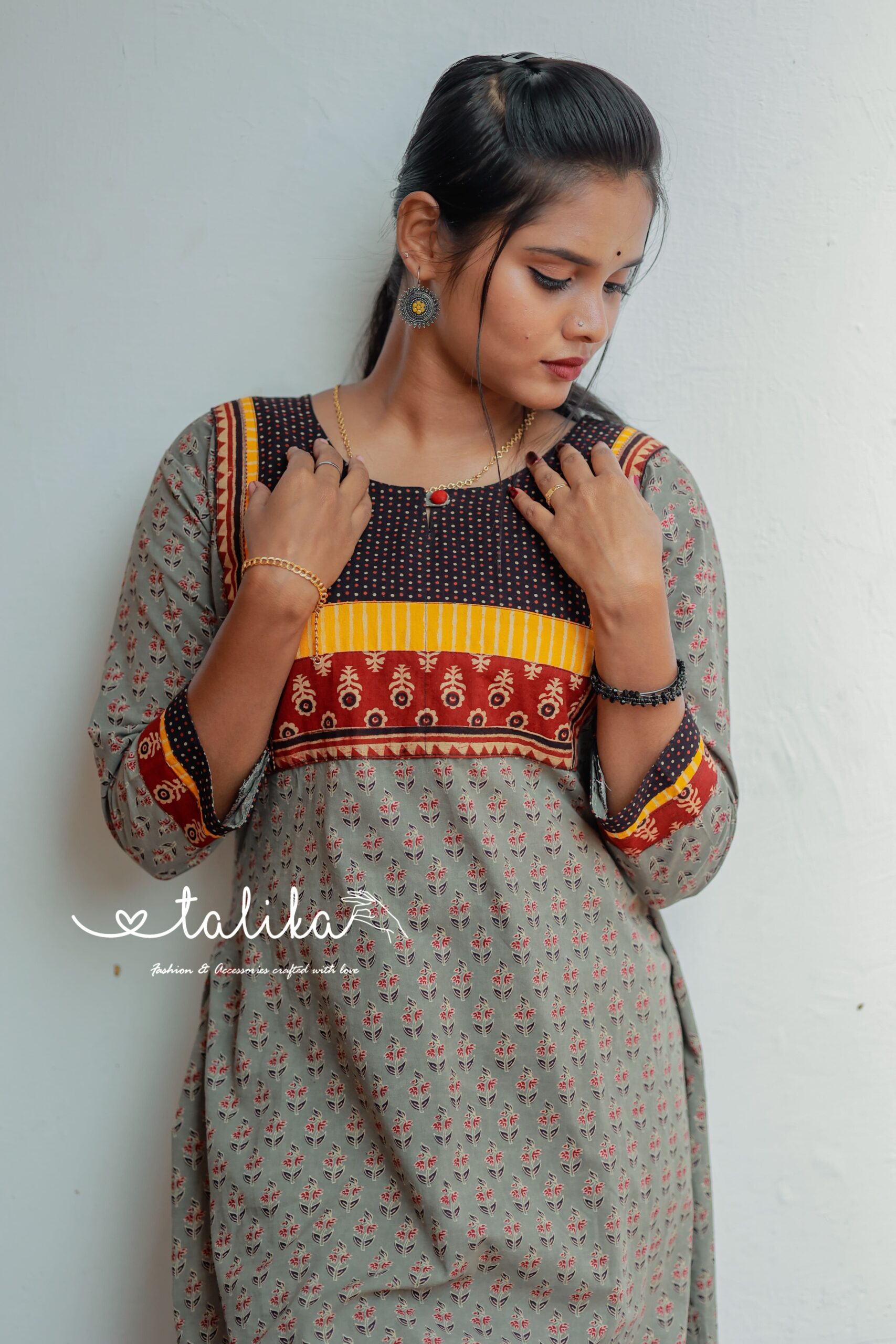 Pure cotton daily wear kurti with patch work ajrakh yoke